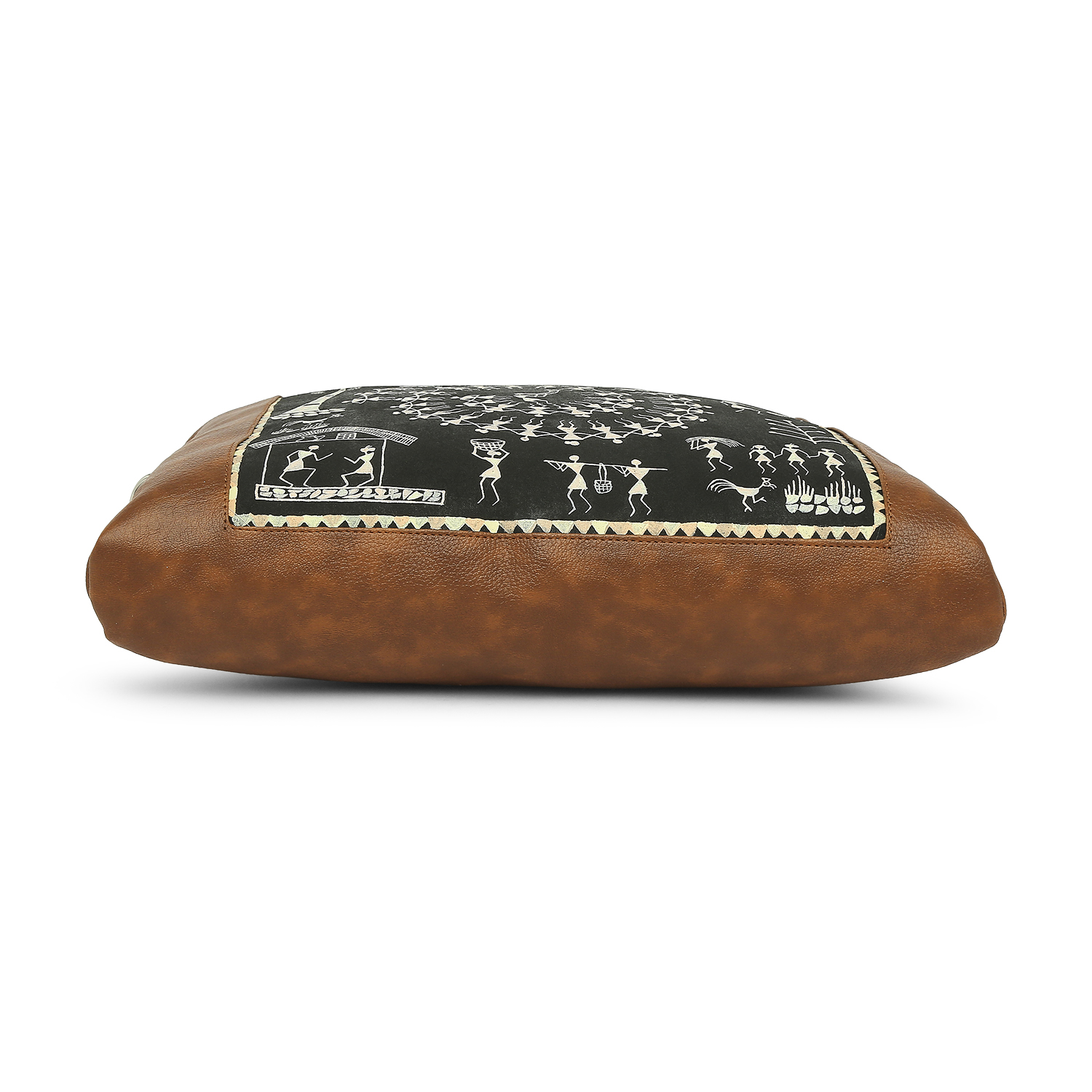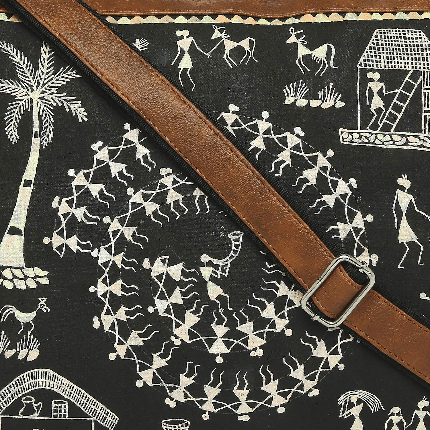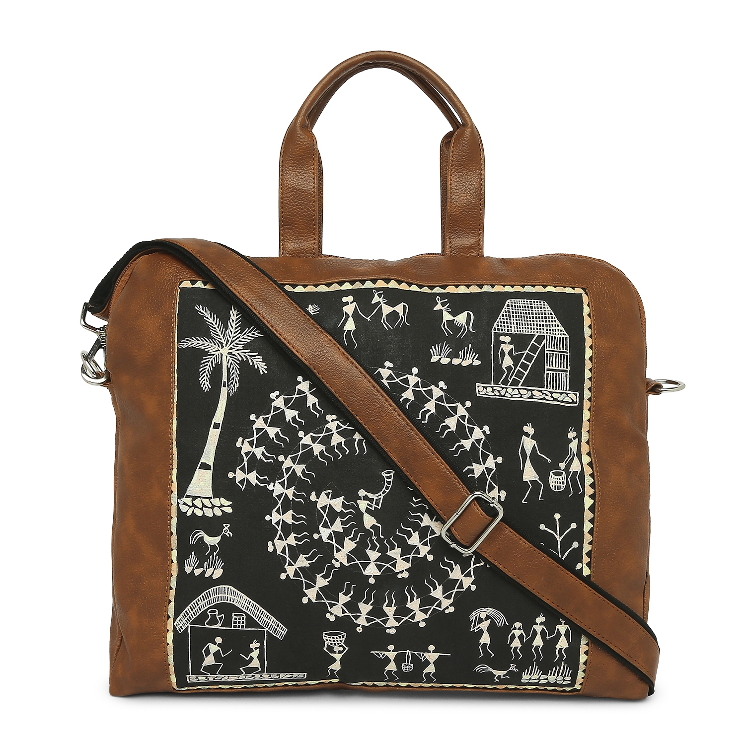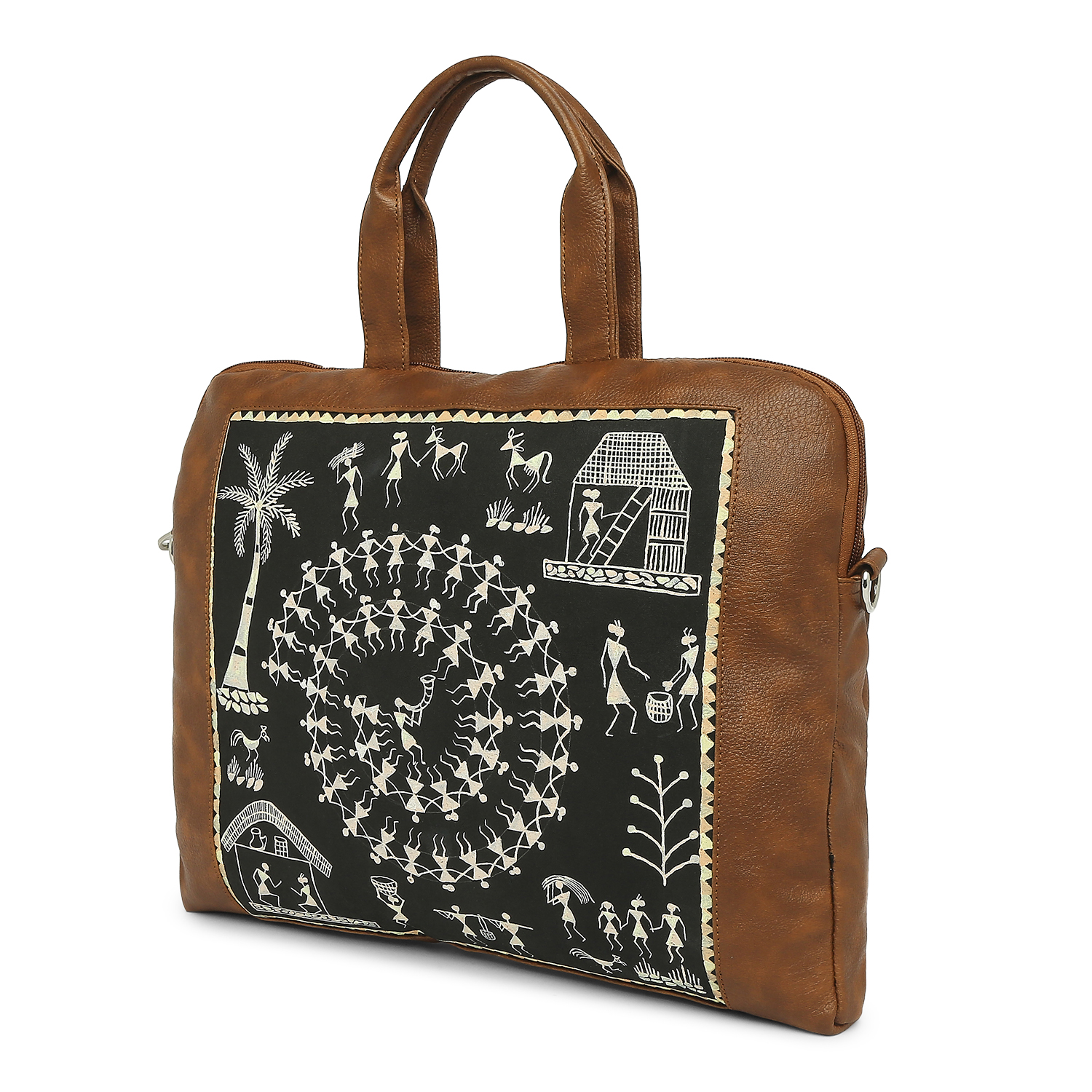 warli hand-painted artwork gives a stylish look to the laptop bag. it is durable and features multiple compartments and a long shoulder strap.